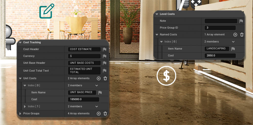 The Cost of the items in the scene can be tracked and displayed. The price of an object may change as soon as the object changes. The Cost Tracking widget keeps track of changes and always shows the current costs.Price Groups are used to categorize cost reports and are created in the Cost Tracking section of the Info Map. The index of the group is used as the Group ID to put the cost item into the category.
