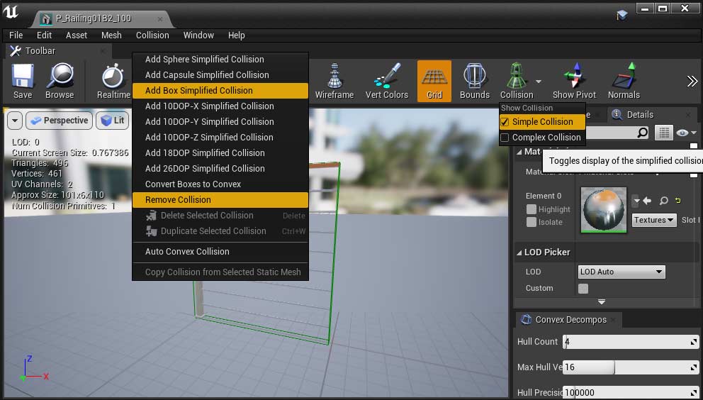- Click the Collision icon and select 'Simple Collision' to show the current collision model(s)